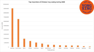 Looking back at the export data of chinese salted hog casing for 2025, China exported salted hog casing to the world around 21,054,917kg, amount around 239,299,777 USD. And Germany continues to stand as the largest and most vital importer of Chinese natural hog casings.